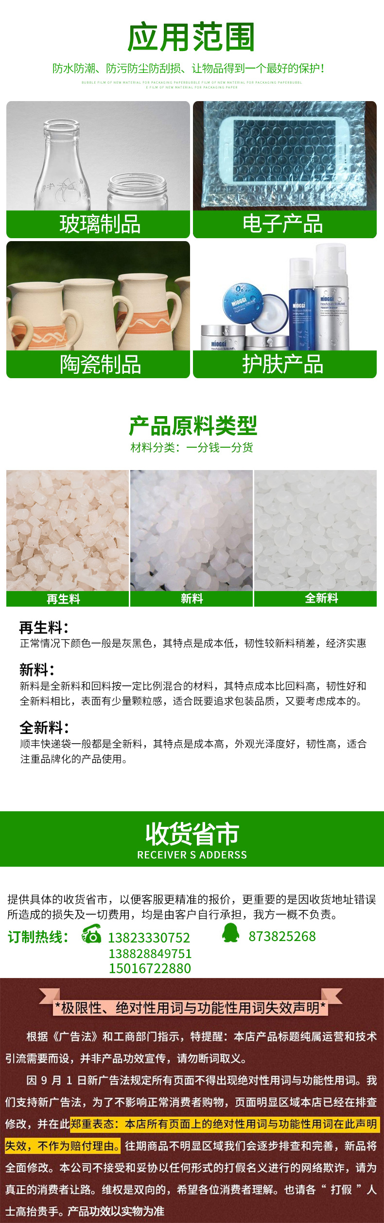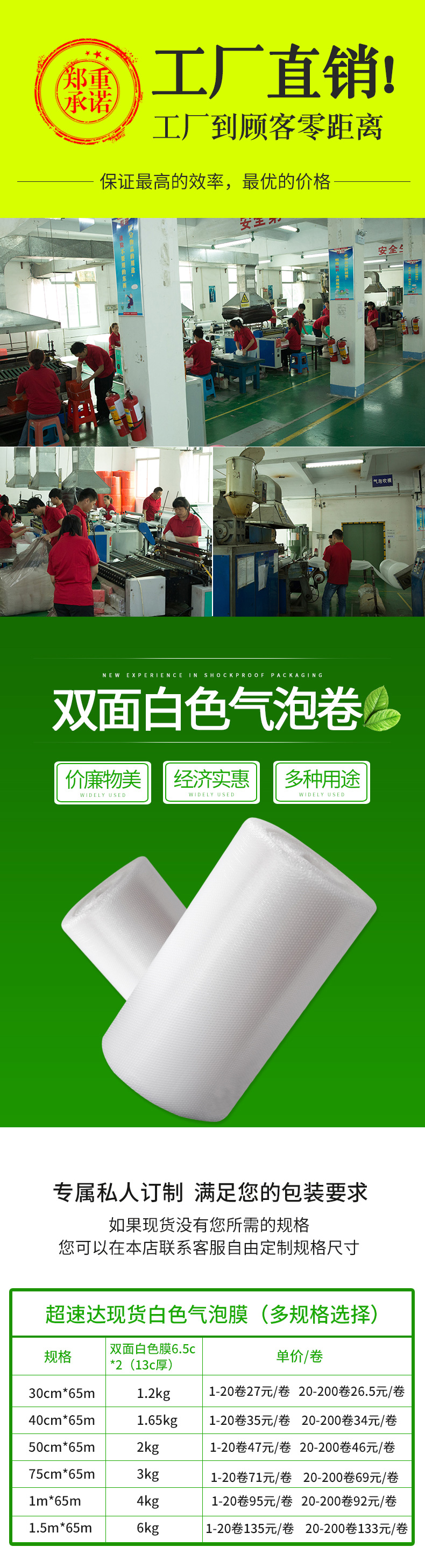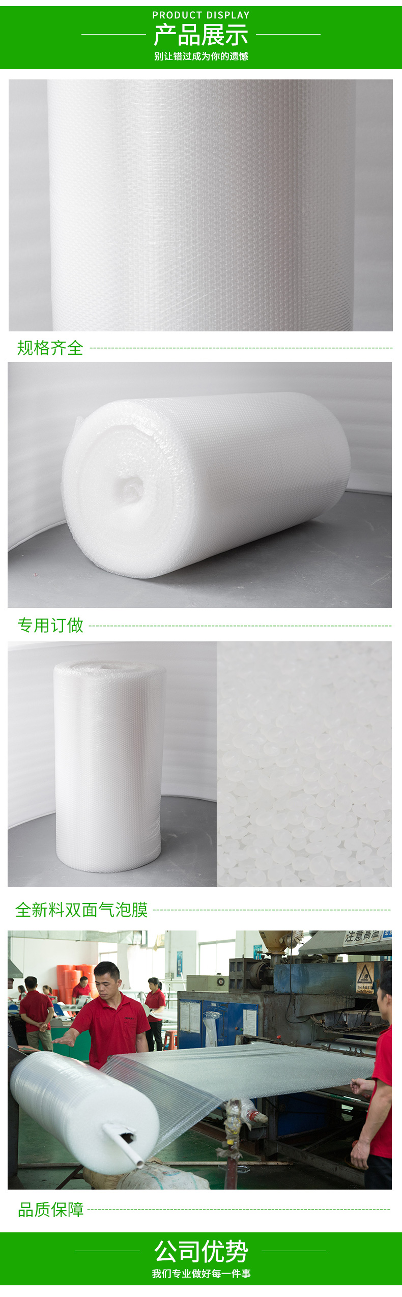 采用聚乙稀PE原料,經(jīng)擠出雙層膜真空復(fù)合成型的氣墊薄膜(簡(jiǎn)稱氣泡膜),產(chǎn)品主要用于儀表、儀器、易碎、易損物品的防震包裝及電子行業(yè)、食品、工藝品、五金、注塑件、日用品等行業(yè)的減震包裝,可生產(chǎn)單面、雙面氣泡卷材、成型袋,小泡φ5MM,普通中泡φ8MM,并可生產(chǎn)達(dá) φ30MM的超大氣泡膜,可生產(chǎn)防靜電氣泡袋,復(fù)合多種膜料的氣泡墊,以上產(chǎn)品均可著色。氣泡卷、氣泡膜、單面氣泡袋、雙面氣泡袋、加厚氣泡袋、紅色氣泡袋、白色氣泡袋、防靜電氣泡袋。